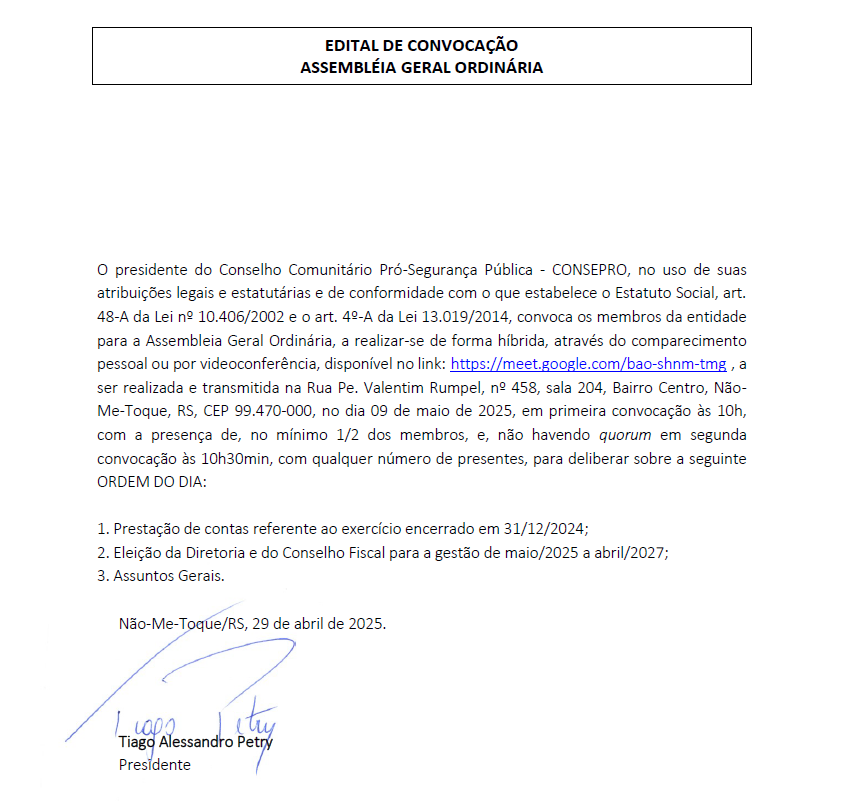 O Conselho Comunitário Pró-Segurança Pública (CONSEPRO) convoca seus membros para a Assembleia Geral Ordinária, que será realizada no dia 9 de maio de 2025, em formato híbrido (presencial e online). A reunião terá como pauta principal a prestação de contas referente a 2024 e a eleição da nova diretoria para o biênio 2025-2027.