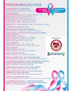 As ações de mobilização começaram por volta das 15h45min, com uma caminhada de abertura do Outubro Rosa, saída da Unidade Básica de Saúde Central indo até a sede da Prefeitura. Dentro da programação, haverá coletas preventivo do câncer de colo de útero e exames de mama nas Unidades Básicas de Saúde do município.