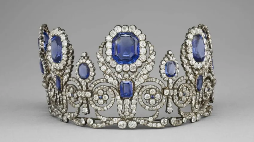 O diadema — um adorno de cabeça com joias usado pela realeza — apresenta 24 safiras do Ceilão e 1.083 diamantes que podem ser destacados e usados como broches, segundo o Louvre.