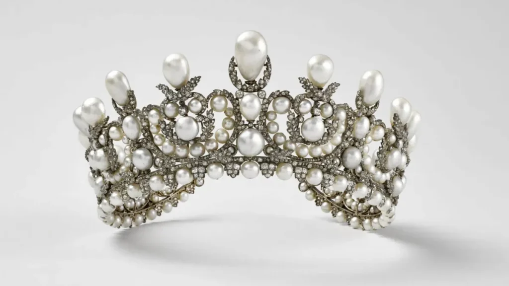 O diadema de pérolas foi feito para Eugénie pelo joalheiro Alexandre-Gabriel Lemonnier em 1853 e contém 212 pérolas e 1.998 diamantes, segundo o Louvre.