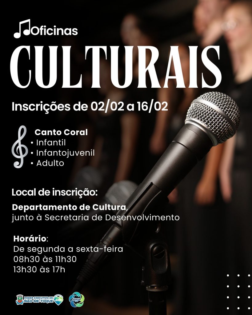 Estão abertas as inscrições para as Oficinas Culturais em Não-Me-Toque, com vagas disponíveis na modalidade de canto coral. As atividades são voltadas para os públicos infantil, infantojuvenil e adulto, com participação permitida a partir dos 7 anos de idade.