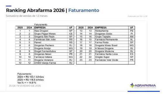 O varejo farmacêutico brasileiro segue em forte expansão e alcançou um marco expressivo, movimentando R$ 118,5 bilhões, com crescimento de 14,9% em relação ao período anterior. Os dados são do ranking divulgado pela Associação Brasileira de Farmácias e Drogarias (Abrafarma), em parceria com a Fundação Instituto de Administração (FIA).A Rede de Farmácias São João se destaca neste cenário ao reafirmar seu desempenho consistente de crescimento, consolidando sua presença entre as maiores redes do Brasil e reforçando sua atuação estratégica, especialmente na região Sul.