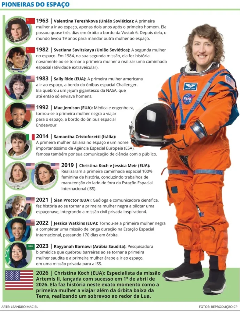 A participação de Koch na Artemis II sucede o histórico de outras mulheres. A primeira a ir ao espaço foi a soviética Valentina Tereshkova, em 1963. O voo feminino seguinte ocorreria 19 anos depois, com a viagem de Svetlana Savitskaya, em 1982, de acordo com os arquivos da agência espacial russa Roscosmos.