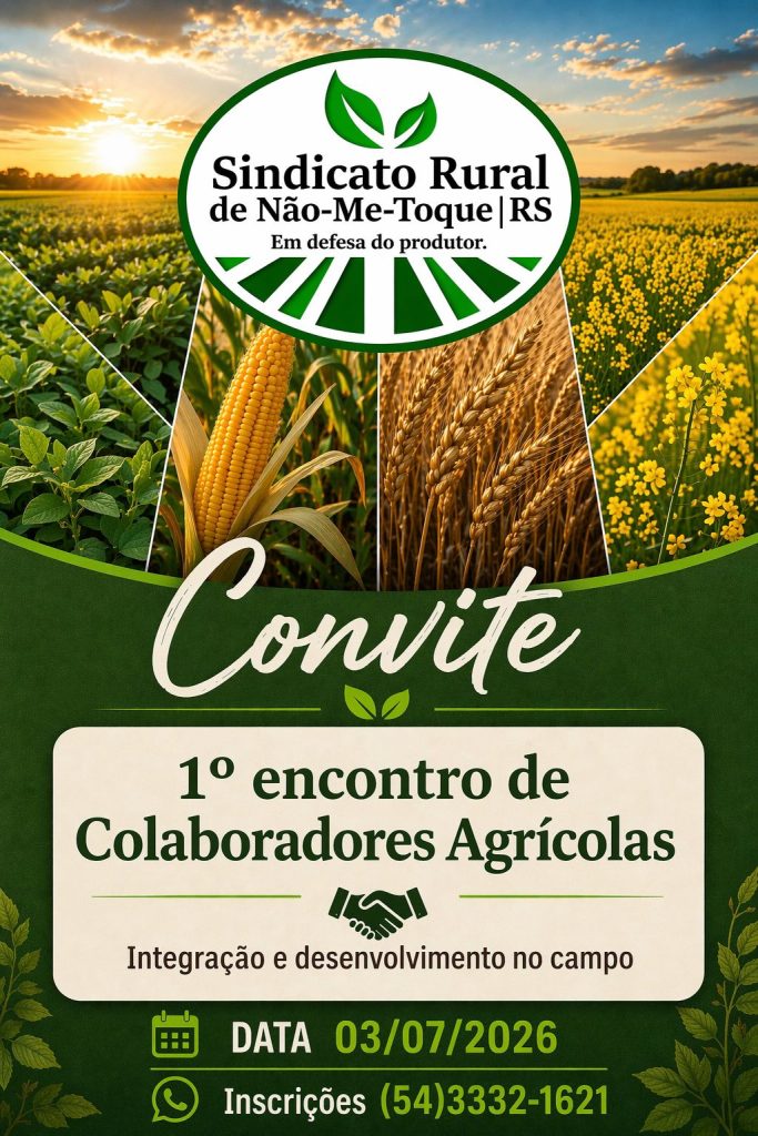 O Sindicato Rural de Não-Me-Toque promove, no dia 3 de julho, o 1º Encontro de Colaboradores Agrícolas, iniciativa voltada à valorização e ao desenvolvimento profissional de quem atua diretamente no dia a dia das atividades no campo.